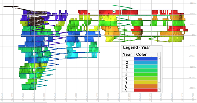 The targeted production rate envisioned in this PEA is 1,500 tons-per-day and, at this rate, the mine life is estimated to be 8 years. The modified Avoca long-hole mining method was selected as the most suitable approach for this deposit with a mining cost of 71$/t. Waste rock generated during initial mine development will be stored on surface stockpiles and later used as backfill material underground.