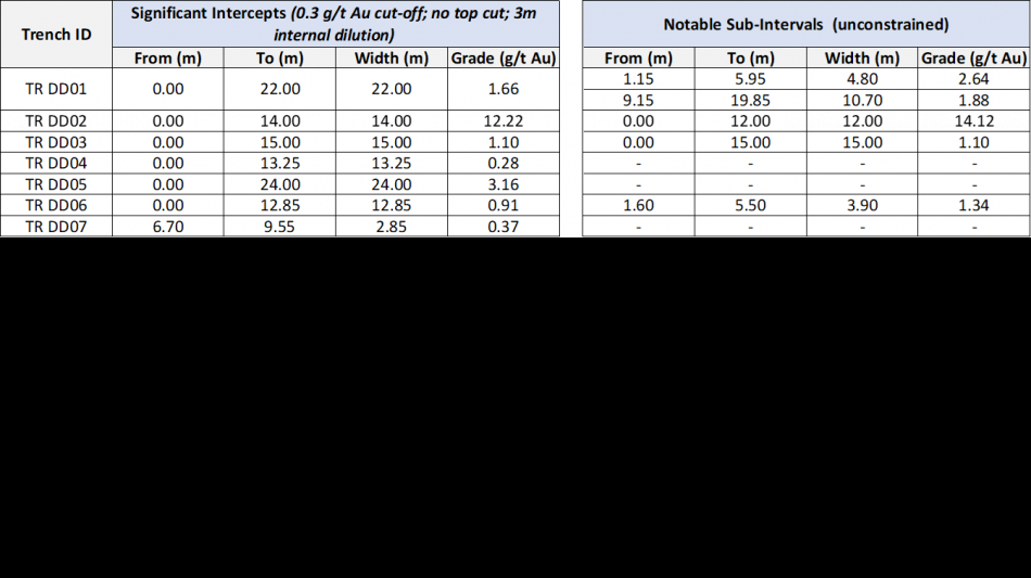 Refer to Appendix B for a summary of significant trench Intercepts (>1.0 g/t Au; 1.0m Internal Dilution) and internal high-grade over-limit sample distribution and gram meter values.