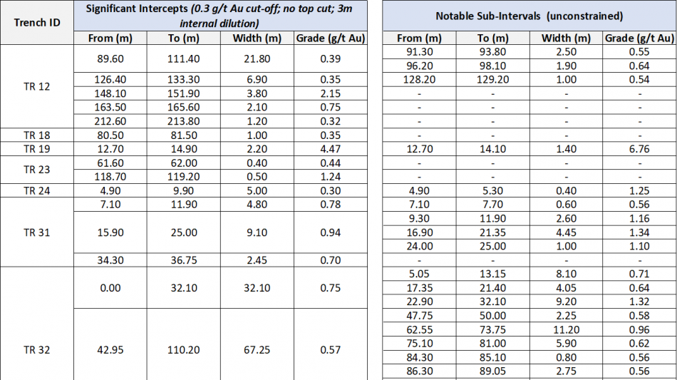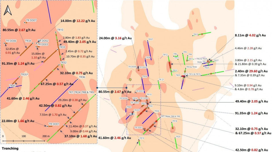 TR34: 80.55m @ 2.67 g/t Au; including 42.35m @ 4.25 g/t Au (ended in mineralization)
