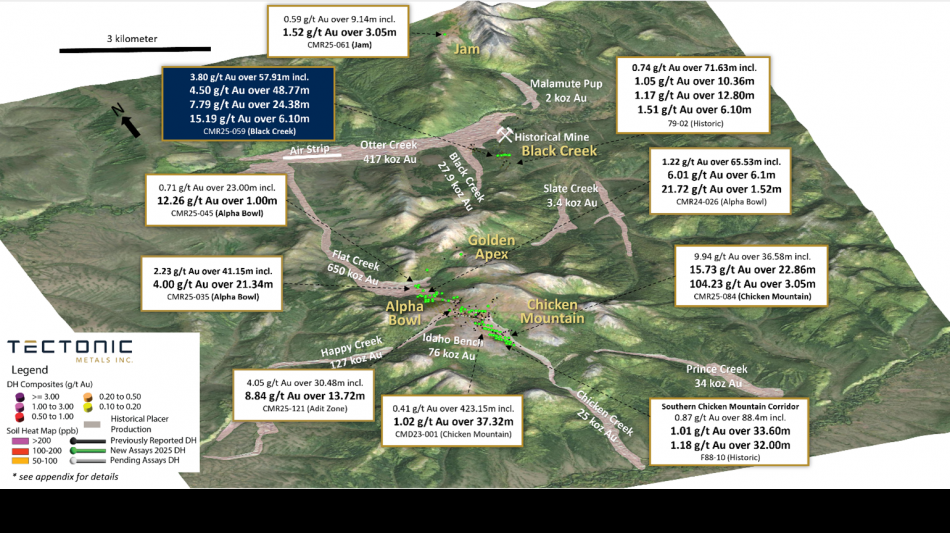 Tectonic drill hole CMR25-059 returned 4.50 g/t Au over 48.77 metres ("m"), including a high-grade core of 7.79 g/t Au over 24.38 m with 15.19 g/t Au over 6.10 m, starting from surface . At present the intercepts are reported as downhole lengths, as insufficient data exists to determine true widths. Mineralization occurs as quartz veinlets and stringers hosted in hornfelsed, oxidized silltstones and intermediate dykes along the eastern contact of the Black Creek. This represents Tectonic's first-ever drilling at Black Creek and marks the first drilling in the area since 2003, confirming a significant new gold zone that expands the known footprint of Flat's reduced intrusion-related gold system ("RIRGS").
