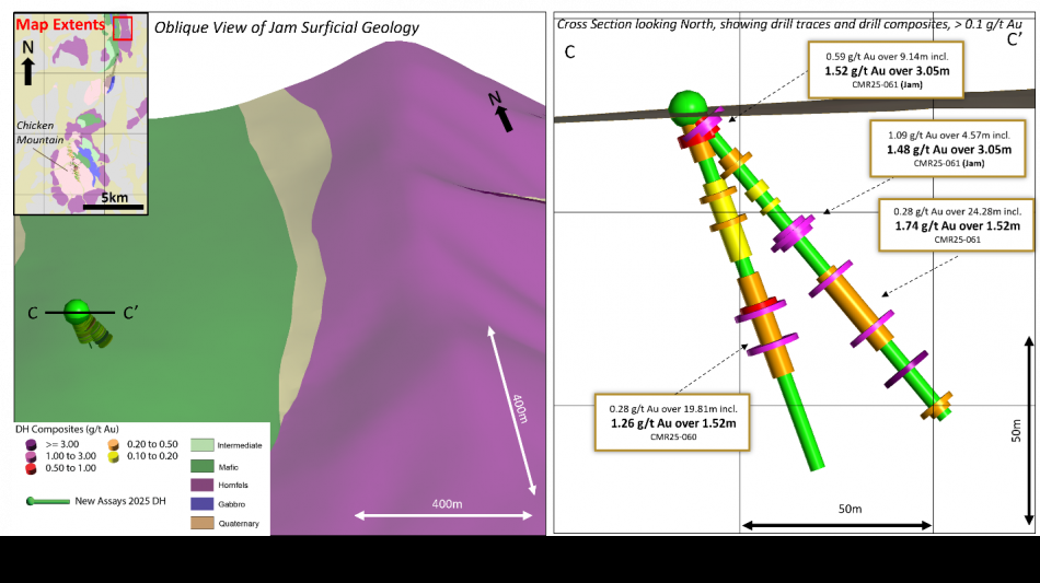 First-ever drilling at Jam target intersects multiple gold zones in volcanic rocks 10 kilometres north of Chicken Mountain