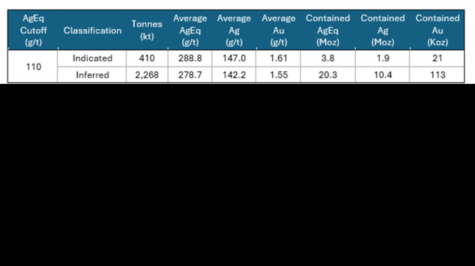 Inferred Mineral Resources increased by 630% relative to the previous historical Mineral Resource Estimate1,2 to 20.3 million silver-equivalent3 ("AgEq") ounces (oz), despite ongoing mining activities (2.27 million tonnes (Mt) @ 142.2 g/t silver (Ag) and 1.55 g/t gold (Au), containing 10.4 million ounces (Moz) Ag and 113 thousand ounces (Koz) Au).