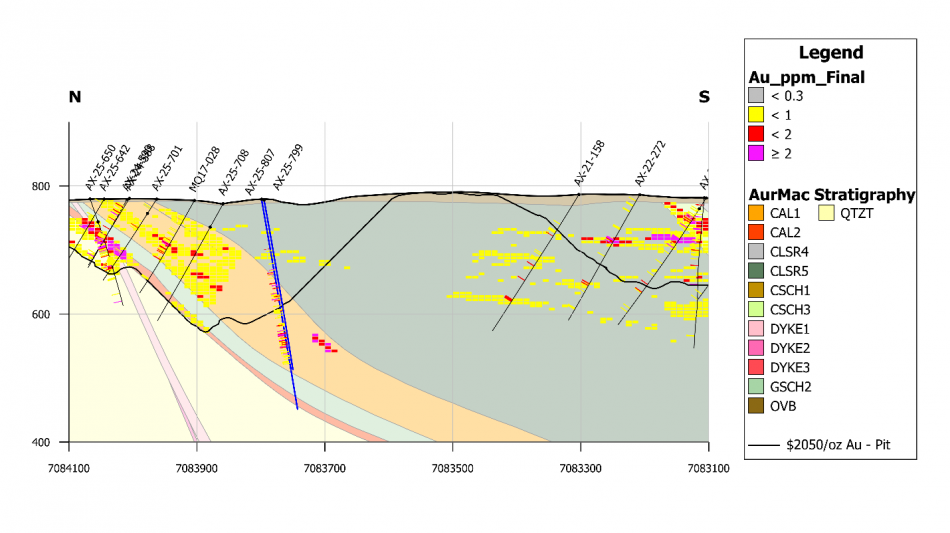 "These holes show there is potential for additional mineralization in multiple calcareous metasedimentary horizons, and very-high grade mineralization potentially extending to depth at Airstrip," stated Duncan Mackay, VP Exploration. "The horizons extending from Airstrip underneath Powerline have the potential to extend the conceptual pit and present promising exploration targets at depth. We have also intersected calc-silicate horizons below the lower calcareous metasedimentary horizon (Cal 2; see Figure 2) indicating potential for additional high-grade mineralization at depth in the footwall of Airstrip. The high-grade skarn intersections in AX-25-799 and -807 also have potential to convert waste blocks and extend the conceptual pit boundary, narrowing the gap between Airstrip and Powerline."