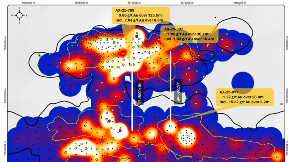AX-25-807 - 1.93 g/t Au over 10.4m and 1.00 g/t Au over 36.1m within 0.64 g/t Au over 145.5m
