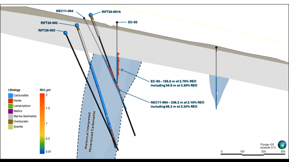 Drill hole RIFT26-002, collared approximately 100 metres ("m") south of historical hole NEC11-004 intersected carbonatite over an approximately 330 m interval starting at 178 m downhole and extending through the interpreted mineralized zone (see Fig 1 and Fig 3)