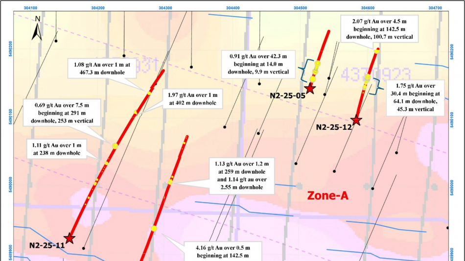 N2-25-012: 1.75 g/t Au over 30.4 metres beginning at 64.1 metres downhole, 45.3 metres vertical. Highlight intervals include 3.51 g/t Au over 10.5 metres and 19.2 g/t Au over 0.51 metres.