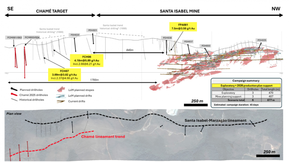 Figure 5- Long‑section showing the Chamé Target and the Santa Isabel Mine trend. Historic drillholes FCH06 and FCH07, along with all other 1980s drillholes, are positioned at the Chamé Target region but were drilled to test the strike continuity of the Santa Isabel Mine shear‑zone-hosted gold trend. In contrast, drillholes FCM001/002 and FCM003/004 are also located at the Chamé Target but were collared on a parallel trend situated in the hanging wall of the Santa Isabel Mine structure. Planned drillholes PDH020 and PDH021 are designed to test the main Santa Isabel trend, while planned holes PDH038, PDH037, PDH003, and PDH025 are designed to support the mine planning team by providing direct geological exposure to the host rocks and confirming the potential gold grade and thickness of the targeted stopes.