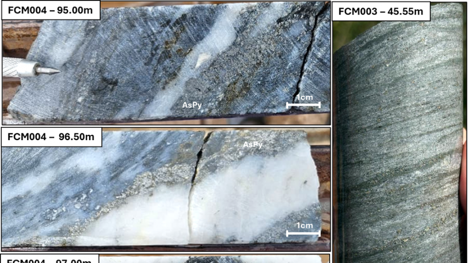 In addition, the team is gaining greater geological understanding from the visual logging of the second pair of drillholes, FCM003 and FCM004. Drill hole FCM003 exhibited intense sericitization and sulphide alteration, while FCM004 showed alteration styles more proximally associated with potentially higher-grade mineralization. These observations are crucial for refining the geological model and targeting strategy (see Figure 4 - representative core photos).