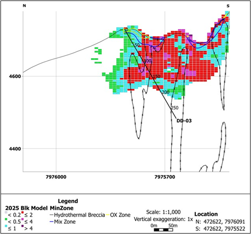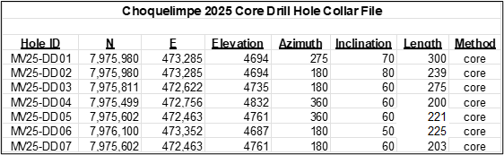 Hole MV25-DD03 has been drilled (depth of 275 meters) to explore the Choque Zone (Figure 1 & Table 1) at depth, below the area where higher gold grades have been calculated within the 2025 resource model (Wilson, 2025), (Figure 4). The hole intersected argillically-altered DAP.