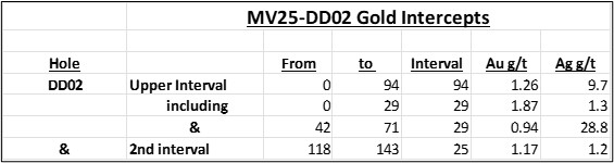MV25-DD02 intersected 94 meters at 1.26 g/t Au, including 31 meters at 1.79 g/t Au.