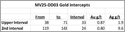 MV25-DD03 intersected 33 meters at 0.87 g/t Au.
