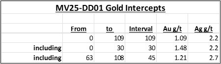 MV25-DD01 intersected 109 meters at 1.09 g/t, including 45 meters at 1.21 g/t Au.