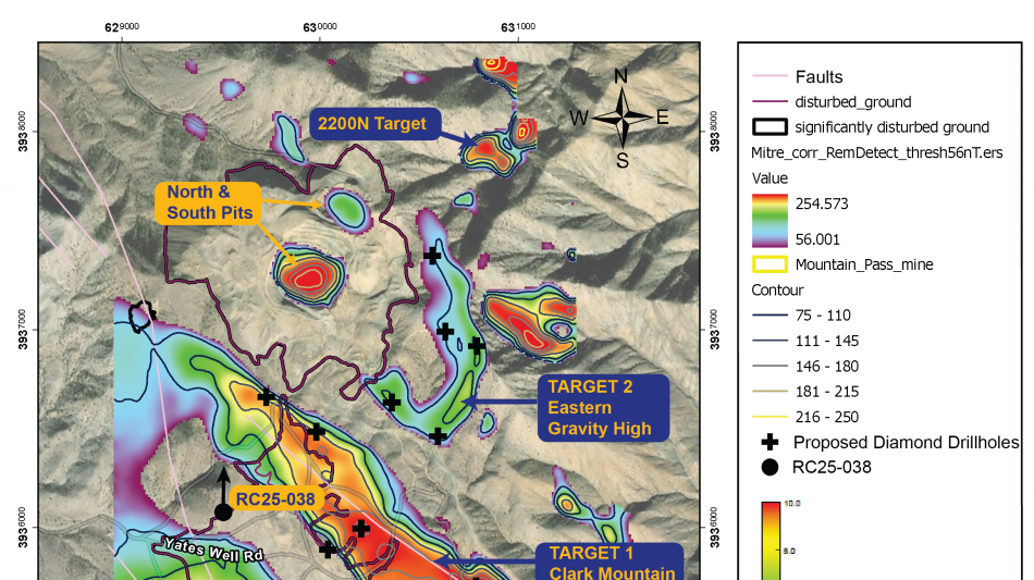 The combined interpretation has refined three distinct areas of REE-carbonatite interest at Colosseum. Two, the Clark Mountain Fault corridor and the Eastern Gravity High, are defined clearly enough to progress drilling immediately. The 2200N anomaly, identified in earlier MT survey work, is being further assessed for drilling after this program.