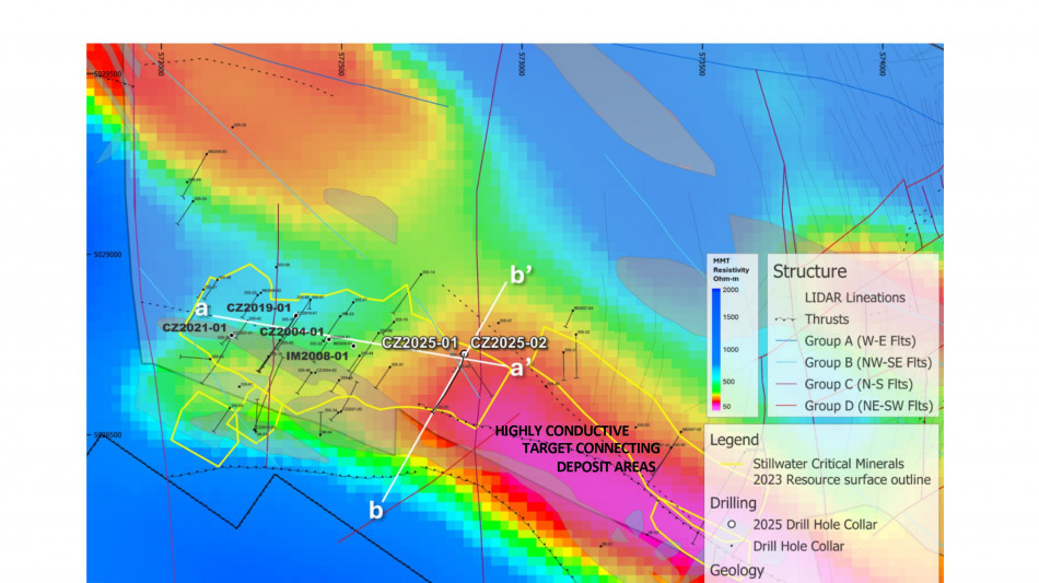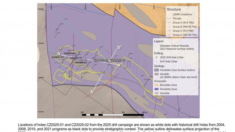 VANCOUVER, BC / ACCESS Newswire / February 26, 2026 / Stillwater Critical Minerals Corp. (TSX.V:PGE)(OTCQB:PGEZF)(FSE:J0G) (the "Company", or "Stillwater") reports the first results from its 2025 resource expansion drill campaign at the Company's 100%-owned Stillwater West project in Montana, USA. Stillwater West is one of the few U.S. critical minerals projects with a significant nickel and platinum group element ("PGE") resource and is located immediately adjacent to Sibanye-Stillwater's Stillwater mines, the only primary PGE producer in the United States. This release is focused on the CZ deposit area at Iron Mountain where drilling intersected shallow, near-surface sulphide-rich polymetallic nickel-copper-cobalt-platinum-palladium-gold ("Ni-Cu-Co-PGE-Au") mineralization that extends beyond the limits of the January 2023 Mineral Resource Estimate ("MRE").