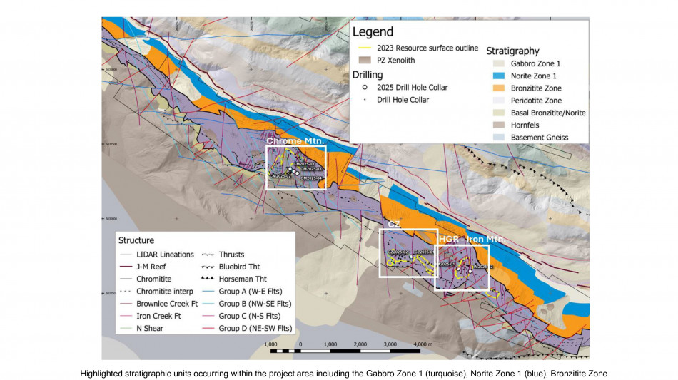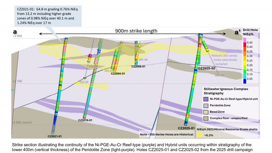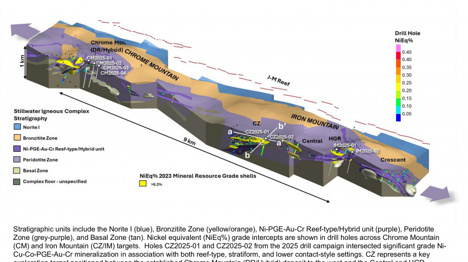 Dr. Danie Grobler, Vice-President Exploration, commented "Our 2025 work defined two near-surface, highly prospective areas at Chrome Mountain and Iron Mountain. All eight holes intersected magmatic sulphide mineralization, confirming that the large geophysical anomalies map sulphide-rich stratigraphy beyond current resource boundaries. At Iron Mountain, the CZ deposit conductive trend appears to connect toward the Central-HGR resource areas, while at Chrome Mountain a large anomaly extends to the southeast-together indicating potential continuity over a 10-kilometer strike length of mineralized magmatic stratigraphy. These results validate our model and materially expand the set of drill-ready targets for resource growth. Furthermore, our current geological interpretation including results from CZ2025-01 indicates probable thrust-fault duplication of the lower Peridotite zone with its mineralized zones in the CZ deposit area, as shown in Figures 8 and 9."