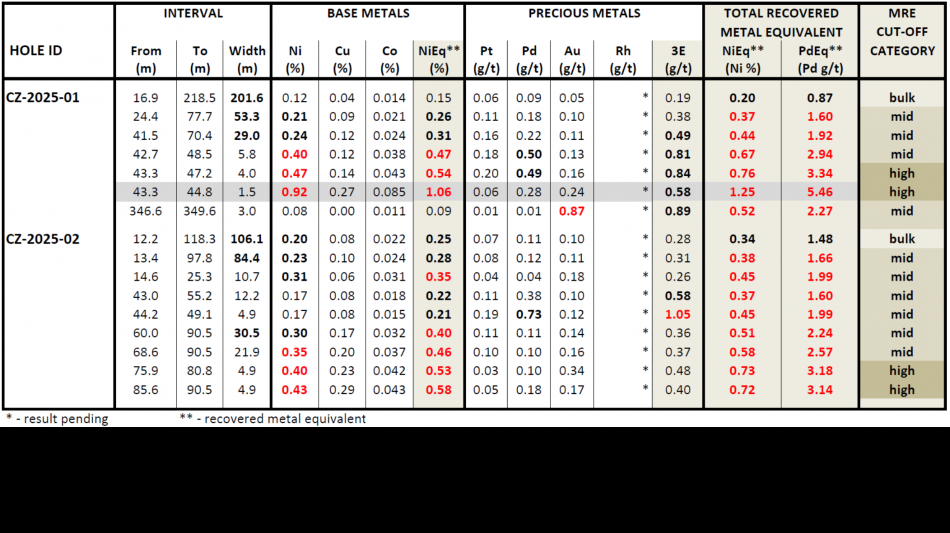 The CZ deposit drill results confirm the Company's updated model for sulphide-rich mineralization within the Peridotite and Basal Zone contact and demonstrate scale - from broad, near-surface bulk-tonnage envelopes to internal higher-grade horizons that could support selective mining and blending scenarios.