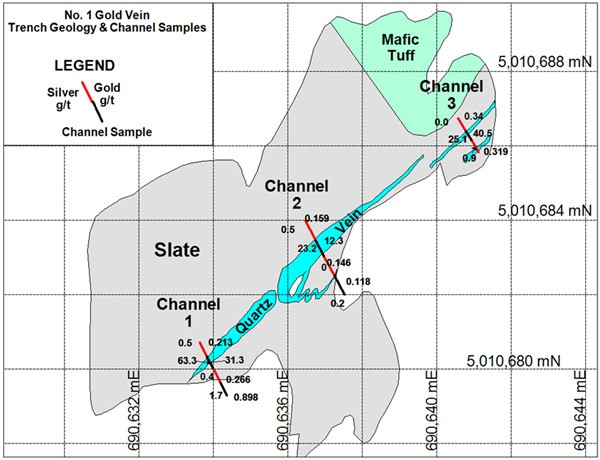 The Company has plotted the results of channel samples cut across the No. 1 vein. Eleven samples each 0.40 meters in length were cut in 3 channels that cross the vein and extend into the wall rock on both sides. Assays of the vein are 31.3 g/t gold, 12.3 g/t gold and 40.5 g/t gold plotted on the right side of the channel along with 63.30 g/t silver, 23.2 g/t silver and 25.1 g/t silver plotted on the left side of each channel as shown on Figure 2.