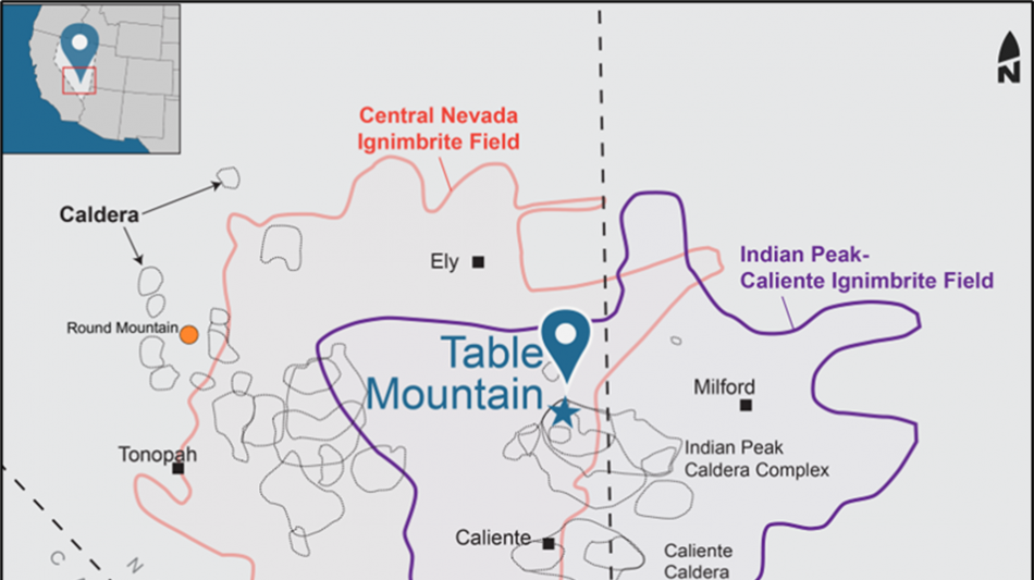 The Table Mountain project consists of 184 lode claims located forty-five kilometres north of the town of Pioche within the Oligo-Miocene Indian Peak Caldera complex (Figure 1) in eastern Nevada. The claims are located on ground managed by the BLM with rough road access.