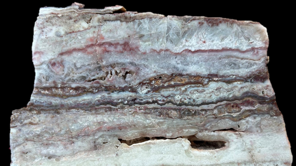 The property is cut by widespread veining with vein widths locally exceeding three metres and returning anomalous precious metal values of up to 2.62 g/t gold and 49.7 g/t silver. The multiple outcropping veins display textures including crustiform-colloform fine-grained quartz and coarse silica after platy calcite typical of low-sulphidation epithermal veins (Photo 1).