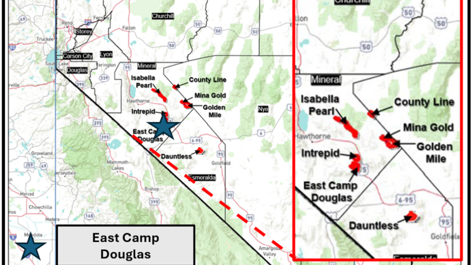 East Camp Douglas property is in the Silver Star mining district in Mineral County, Nevada, located approximately 6 mi (10 km) southwest of the town of Mina. The property covers 5,583 acres (2,259 ha) consisting of 293 unpatented lode mineral claims, 24 unpatented placer claims, 12 patented mining claims, and three fee land parcels. Low-sulfidation gold-bearing mineralization associated with a silica lithocap is observed in the southern portion of East Camp Douglas, while the northern portion of the East Camp Douglas area contains high-sulfidation style gold-bearing mineralization. Fortitude Gold exploration drill programs have intercepted high-grade gold mineralization in both the south and north portions of the property.