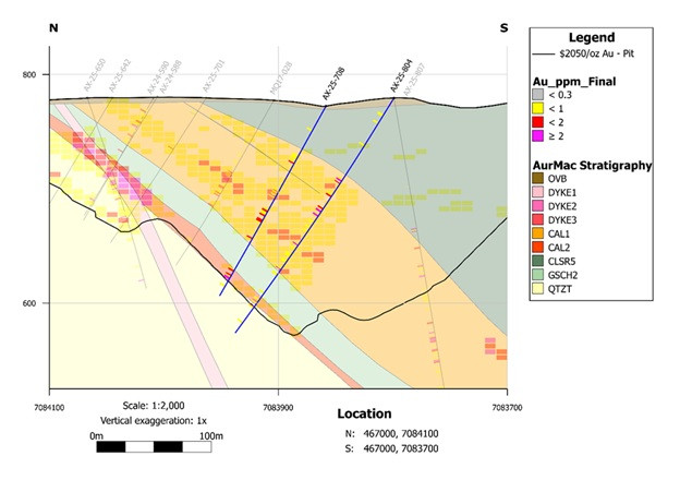 AX-25-804 - 1.42 g/t Au over 3.7m, 1.79 g/t Au over 1.4m, and 1.94 g/t Au over 8.9m, all within 0.50 g/t Au over 102.7m.