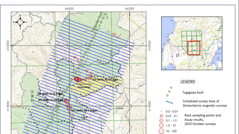The Company is currently finalizing its contemplated 2026 field activities at the Shika prospect. Mid-year, the Company currently plans to continue its field mapping program and conduct a drone-borne, high-resolution magnetic geophysical survey with 100 m line spacing over the historical Unoya mine area. This survey will cover an area of approximately 4.0 km by 2.5 km encompassing the 1.2 km corridor of high-grade gold vein float samples well as areas of elevated Au and pathfinder element values identified by BLEG surveys and soil geochemical surveys (Fig. 2). Survey lines will be oriented perpendicular to the strike of the Togigawa Fault and general trend of regionally dominant vein orientations.