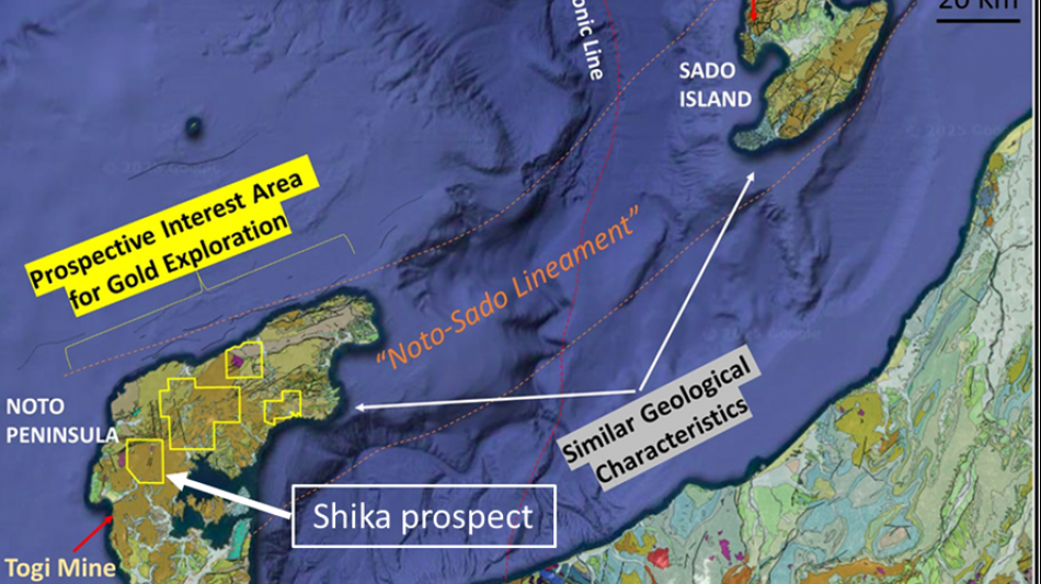 The Noto Peninsula shares geologic similarities to nearby Sado Island, host to the historic gold mine, Sado Kinzan (Mitsubishi Material Corporation). The Sado mine operated continuously for 388 years starting in 1601 under the direct control of the Tokugawa Shogunate and recorded production of 2.51 million oz Au and 74 million oz Ag (The Mining and Materials Processing Institute of Japan, 1994, Nihon Kinzanshi 4. Kanto and Chubu).