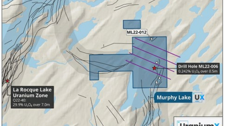 Murphy Lake is located in the northeastern Athabasca Basin, approximately 5 km south of IsoEnergy's (TSX: ISO) Hurricane Deposit, which hosts an indicated mineral resource of 48.6 million pounds U3O8 at an average grade of 34.5% U3O8 (source: IsoEnergy Ltd. public disclosure), and 4 km east of Cameco's (TSX: CCO) La Rocque Lake Uranium Zone, where drill hole Q22-040 intersected 29.9% U3O8 over 7.0 metres.