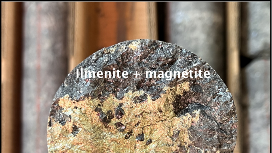 During geological logging, all three holes intersected visually identifiable sulfide mineralization across broad intervals. Observed sulfide minerals include chalcopyrite with associated sulfides occurring as disseminations and veinlets over intervals of approximately 100-450 metres downhole. Ilmenite, the principal titanium-bearing mineral within the Titac South resource, is observed throughout the intrusion in each hole.