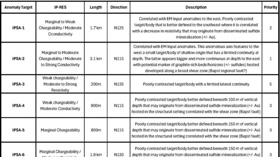 High-priority IPSA-2 and IPSA-8 targets at Bapst West and Bapst East are structurally controlled by the Bapst fault deformation zone, a 7.3-kilometre prospective strike length, in which this regional structure as indicated by the deformation zone, suggests a significant opportunity and high potential for concentrated mineralization. The Bapst fault acts as a significant regional structure, hosting multiple peripheral mineralized zones with high-grade, promising potential outside the current property boundaries, highlighted by historical assay results including 5.6 g/t Ag over 1.4 metres and 1.9 g/t Au over 2.5 metres. The linear conductive targets adjacent to the Bapst fault are interpreted as exhalative horizons containing significant sulphide-graphite mineralization, which host mentioned historical Au and Ag concentrations along the northwest and southeast trends beyond but close to the property boundaries(Fig. 3).