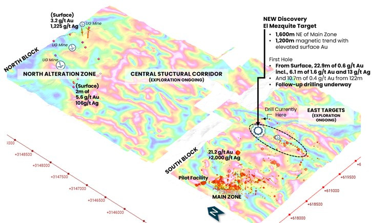 Figure 1. Drone magnetic survey map showing tilt derivative of the Reduced to Pole (RTP) and priority target areas identified to date by geological mapping and surface geochemistry. Location of the new El Mezquite target area.