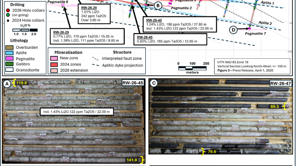 Table 2 following presents the composite assay results received to date, and the intervals of anticipated mineralization along the other holes that were fully logged at the time of this news release. The main pegmatite (Zone 3) shows downhole intersection lengths ranging from about 2.0 m in hole RW-26-49 at its northeastern limit to over 25.0 m in hole RW-26-45, confirming the continuity of the core zone defined previously. Nine other holes have intersected Zone 3 with a thickness averaging 13.0 meters. Zone 2 has been intersected in 6 holes with thicknesses ranging from 5.0 to 15.0 meters. Holes RW-26-29 and 30 have intersected the thin Zone 4 very close to the top.