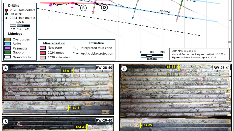 1.51% Li2O and 242 ppm Ta2O5 over 3.60 m, and 0.77% Li2O and 170 ppm Ta2O5 over 15.05 m (including 1.39% Li2O and 111 ppm Ta2O5 over8.00 m)in hole RW-26-29