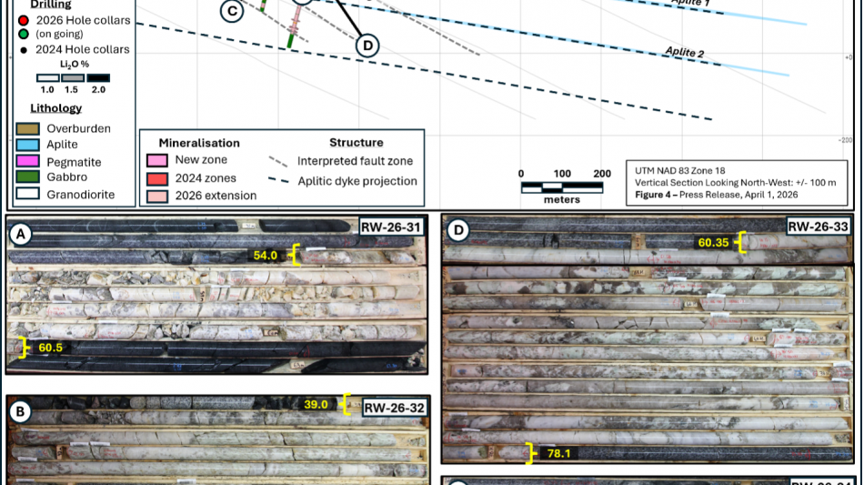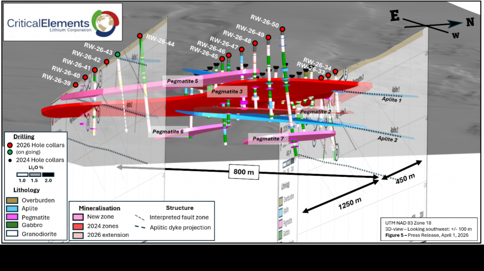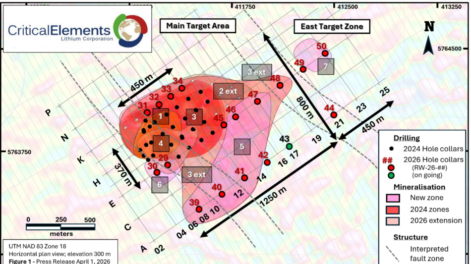 MONTRÉAL, QC / ACCESS Newswire / April 1, 2026 / Critical Elements Lithium Corporation (TSX-V:CRE)(OTCQX:CRECF)(FSE:F12) ("Critical Elements" or the "Corporation") is pleased to provide an update on its Phase 1 Winter 2026 drill program, at the 100% owned Rose West Discovery ("Rose West"), located in Eeyou Istchee, Québec. Rose West is situated within 10 km of the highly advanced Rose Lithium-Tantalum Project ("Rose"). Rose West was previously documented as a near surface, sub-horizontal 10-40 m thick lithium-rich pegmatite bearing zone intercepted by drilling over a 450 m x 370 m footprint area in the winter of 2024 (see Press Release dated February 3, 2026). Recent drilling confirms the presence of spodumene rich intervals all around the initial core zone, and especially towards the East Target area, extending the main pegmatite body by about 800 meters towards the east and by about 400 meters to the south, thus bringing its overall footprint to 1250 m x 800 m. Furthermore, the recent drilling has identified three (3) new spodumene-bearing pegmatitic bodies within the target area; a significant addition to the working model as it could potentially lead to rapid growth of the mineral inventory within the footprint of the project.