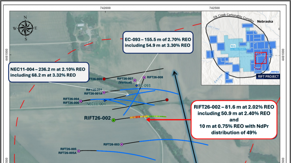 VANCOUVER, BC / ACCESS Newswire / April 7, 2026 / Apex Critical Metals Corp. (CSE:APXC)(OTCQX:APXCF)(FWB:KL9) ("Apex" or the "Company"), a Canadian mineral exploration company focused on the identification and development of critical and strategic metals, is pleased to report assay results from drill hole RIFT26-002, representing the first assay results received from the Company's 2026 drill campaign at it's 100%-held Rift Rare Earth Project, located within the Elk Creek Carbonatite Complex in southeastern Nebraska, U.S.A.