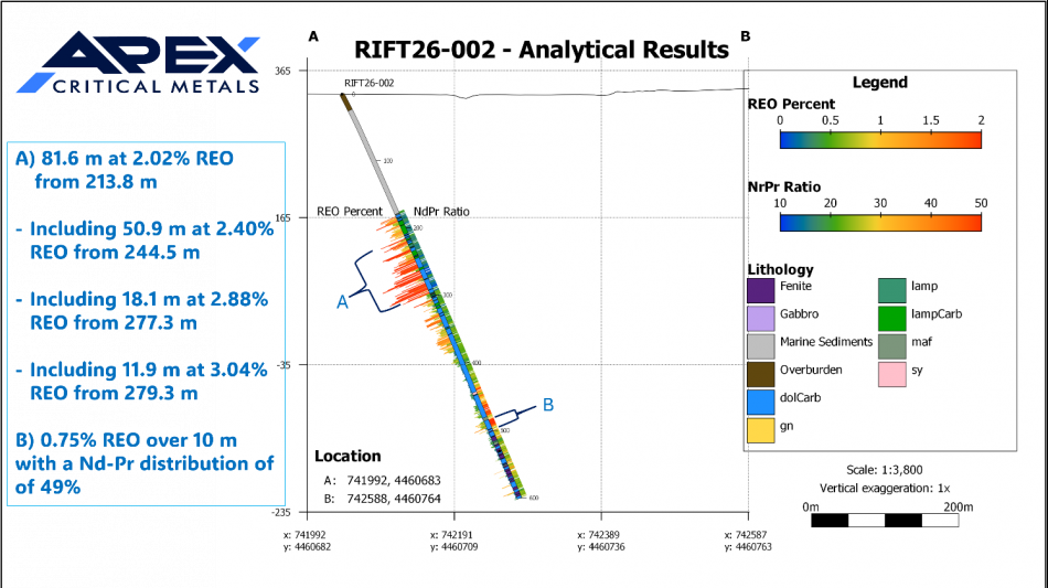 Sean Charland, CEO of Apex Critical Metals, commented: "These first results from our 2026 drill campaign confirm that strong rare earth mineralization at Rift extends well beyond the historical footprint, with over 100 metres of continuous mineralization intersected in a step-out hole to the south. The presence of highly enriched NdPr distributions over meaningful widths further highlights the breath of potential at Rift, not just in terms of absolute REO grade and scale, but also in terms of contained NdPr content, where the value is focused. With rare earth mineralization open in all directions, the Company is well positioned for substantial value creation for our shareholders and we look forward to additional assay results in the weeks ahead."