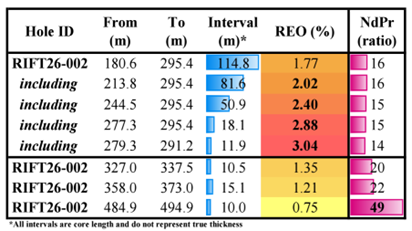 Drill hole RIFT26-002, reported on herein, was designed as more of a regional southern step out to test the continuity of rare earth mineralization beyond historical drilling, targeting extensions from NEC11-004 and EC-93 (Table 1, Figure 1). The drill hole successfully intersected strong grades including 50.9 m at 2.40% REO within a wider mineralized interval of 81.6 m at 2.02% REO with multiple (17) samples assaying over 3.00% REO. The intersection confirms that mineralized carbonatite extends to the south for at least another 100 m; however, when coupled with mineralization in historical drill hole EC-043 (See News Release Dated October 14, 2025), indicate a mineralized zone extending for more than 700 m in strike length (Table 2, Figure 1).