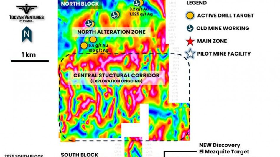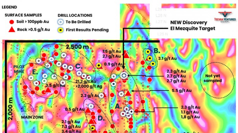 El Mezquite Target - A 350-meter-long soil anomaly with rock samples returning up to 2.7 g/t Au and 24 g/t Ag, aligned with a prominent north-south magnetic linear feature interpreted as a controlling fault structure. A drill rig is currently following up on the target.