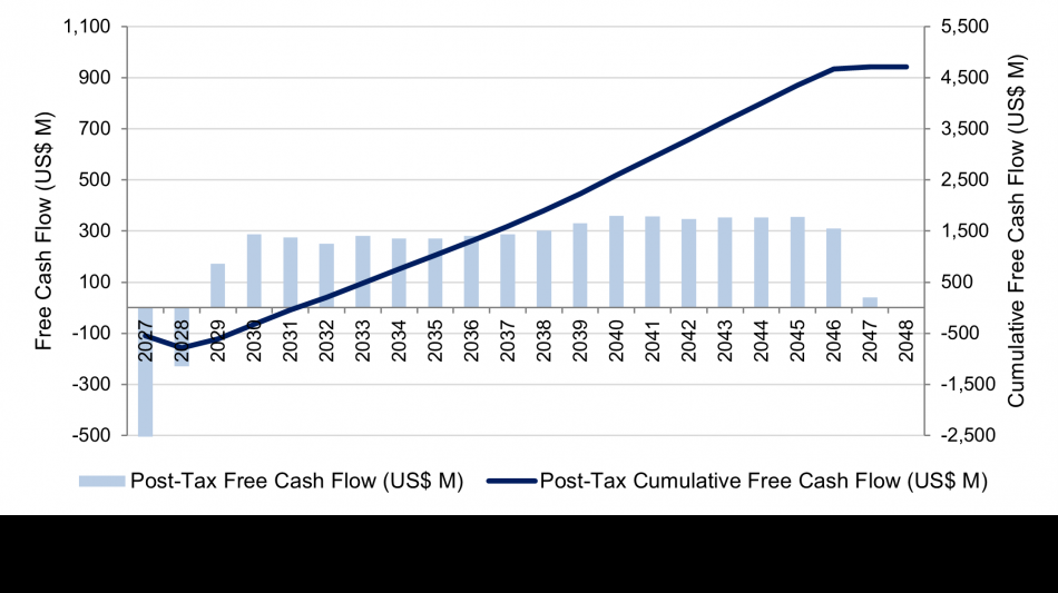 Commissioning is estimated to commence in H1 2028, with initial production in H2 2028 and ramp-up through 2029.