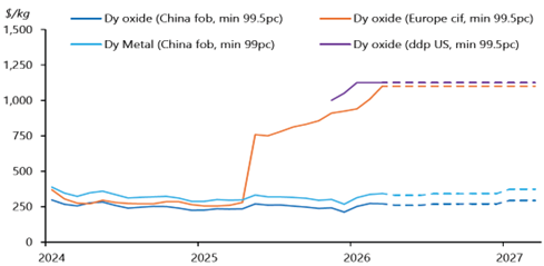 Figure 3: Dy and Tb oxide prices in China (FOB) compared to Europe (CIF), spot and forecast (Source: Argus Media, 2026)