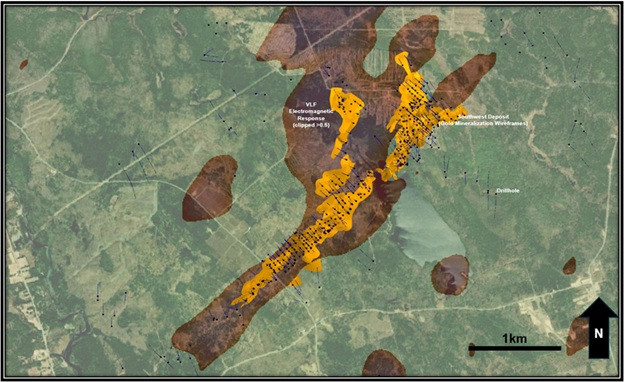 This approach builds on prior geophysical work over the Southwest Deposit (Figure 2), where similar surveys successfully mapped the footprint of mineralization as defined by drilling. The current program is designed to extend this work across the broader project by systematically surveying known deposits to establish a geophysical signature of mineralization. These signatures will be used to define the geophysical response of known deposits and refine our targeting approach, which can then be applied across the 65-kilometre prospective structural corridor.
