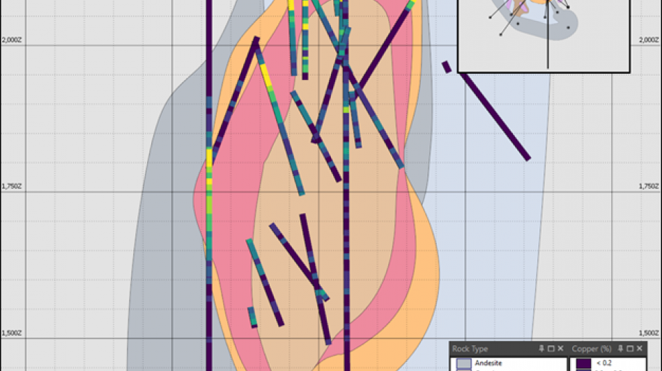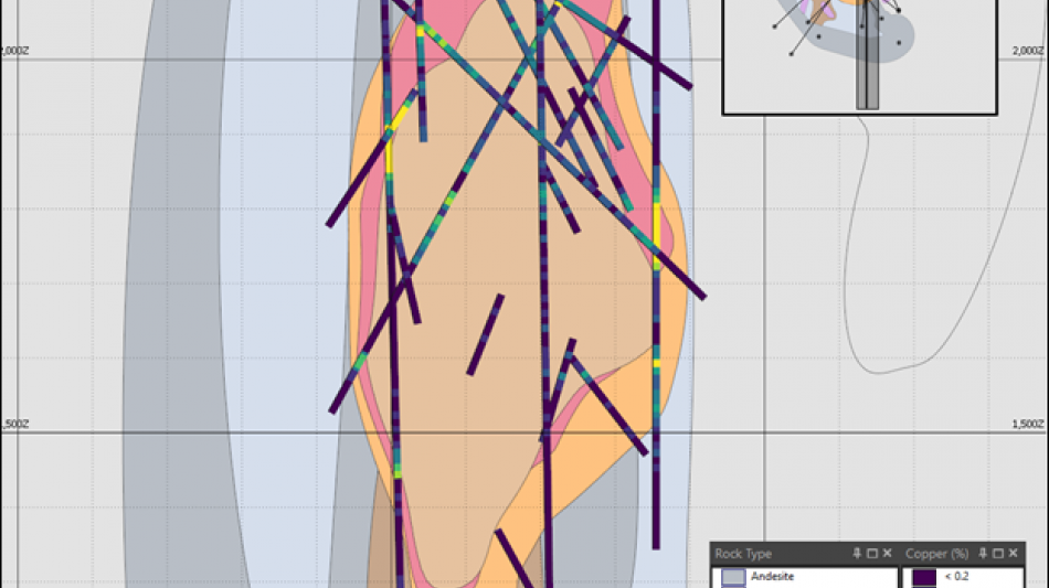 APEX personnel modeled all lithological units identified in the historical plan maps and sections and interpreted several mineralization domains (Figures 1 and 2). Based on the historical data reviewed, the highest-grade copper ("Cu") domain is interpreted as a high-grade shell (the "High-Grade Shell") located outside the interior pipe (the "Interior Pipe"), with an average grade of approximately 2.4% Cu. Surrounding that shell, APEX interpreted and modeled a sheeted vein (the "Sheeted Vein Zone") domain with average grades of approximately 0.9% Cu. The Interior Pipe domain averages 0.60% Cu. APEX personnel also modeled two breccia types-intrusive breccia and sericite-tourmaline breccia-which returned similar average copper grades of approximately 0.3% Cu and may be grouped as a single breccia-style domain for future work. At a broader scale, andesite and quartz biotite form a lower-grade mineralized envelope averaging approximately 0.15% Cu and may likewise be grouped as a single low-grade domain. Additional low-grade mineralized shells were interpreted on the north side of the deposit, but APEX noted that these areas will require additional logging data, including relogging of historical core, and additional drilling to confirm continuity. The grades of these domains are based on length-weighted average %Cu and do not take into account gold or silver by-products at this stage of analysis.
