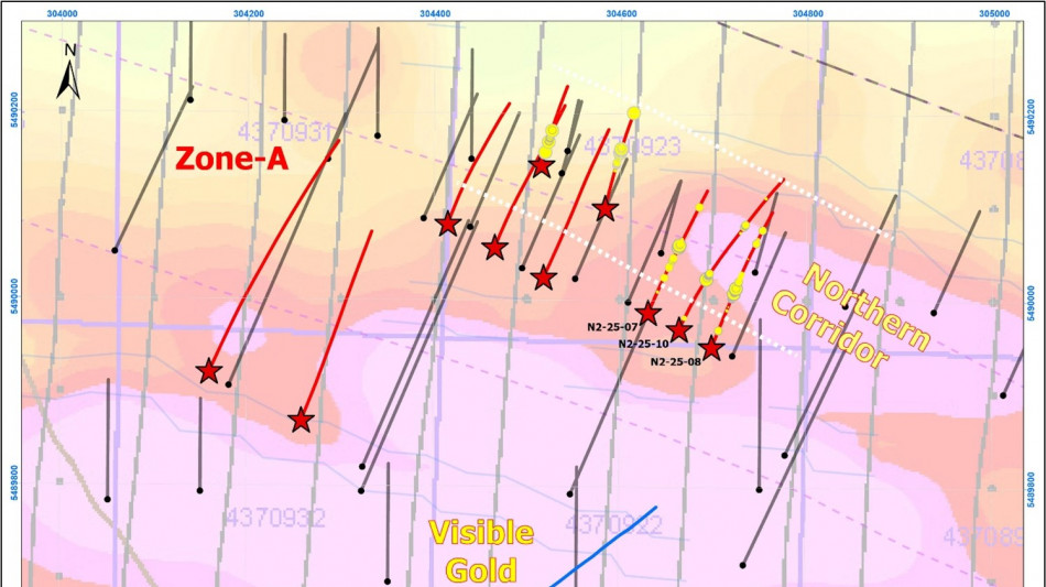 N2-25-006: 1.8 g/t Au over 21.9 metres beginning at 154.4 metres downhole, 133.7 metres vertical. Highlight interval includes 3.4 g/t Au over 4.8 metres with total metal index of 79.56.