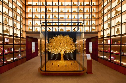 Commanding over the entrance is the brand's signature Gold Ginkgo Tree, which stands 2.1 metres tall and 2.3 metres wide, is adorned with approximately 3,500 pure gold leaves, weighs around 40 kilograms, handcrafted by nearly 50 master craftsmen in close to 60,000 hours, and completed in 2016. Enduring through the ages, the gingko tree stands as a symbol of resilience, grace and blessing. For nearly a century, Chow Tai Fook Jewellery has embodied the same spirit - constantly evolving, yet timeless in its craft.