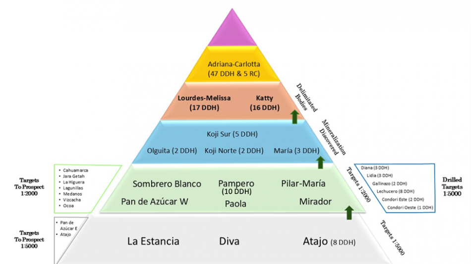Die Kupferoxide, die im Gebiet Pampero mineralisiert sind, haben eine Beständigkeit in der Tiefe aufgezeigt, wobei die geochemischen Ergebnisse in Bohrloch DCH-118 mit einem Kupfergehalt von bis zu 0,5 % und einem Silbergehalt von 3,15 ppm in einer Tiefe von 157,6 m den Grenzen der Hauptstruktur folgen.