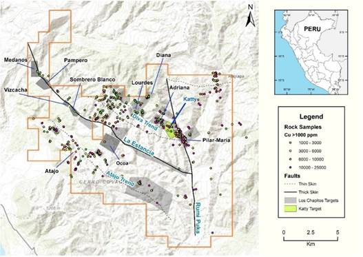 Die Kupferoxidmineralisierung beim Ziel Katty erstreckt sich über eine sichtbare Oberfläche von etwa 700 m mal 650 m. Das Gebiet weist eine Bodendecke auf, die mit Ausbissen einer Kupferoxidmineralisierung durchsetzt ist, was auf die Beständigkeit des mineralisierten Untergrundsystems hinweist.
