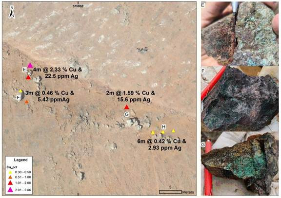 Abbildung 5: Höhepunkte der Kupferschlitzergebnisse bei E, F, G und H. Die Fotos der Handproben zeigen vorwiegend Kupferoxide wie Malachit, Kieselkupfer, Kupfer-Wad und Chalkopyrit.