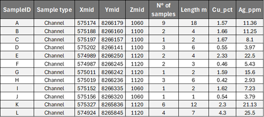 Tabelle 1: Zusammenfassung der Schlitzprobenahmen und beste Abschnitte mit Kupfer und Silber