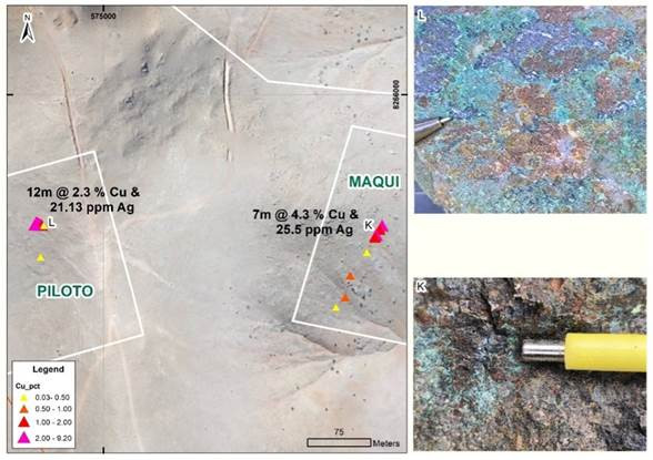 Detaillierte geologische Kartierungen im Maßstab 1:2000 innerhalb des Ziels Katty haben zur Entdeckung neuer Zonen mit einer Kupferoxidmineralisierung sowie zur Zuteilung neuer hochwertiger Ziele wie Maqui, Piloto und Katty geführt (Abbildung 3). Der Schwerpunkt der Explorationsarbeiten liegt auf den Kartierungen und Probenahmen von Kupferoxiden im gesamten Diva Trend und den sekundären Verwerfungen dazu in der Verwerfung Maqui. Die Mineralisierungsart ist Cu-Ag in Form von Mantos, die in dioritischem Porphyr (Intrusivgestein) in Kontakt mit andesitischem kristallinem Tuff (Vulkangestein) vorkommen und aus Kupferoxiden wie Malachit, Kieselkupfer, Atacamit und Kupfer-Wad bestehen, begleitet von Sulfiden wie Chalkopyrit, Bornit und Pyrit, die strukturell von den Verwerfungen Maqui und Diva begrenzt werden.