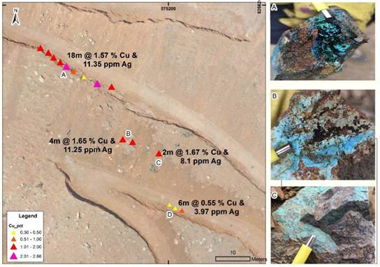 Abbildung 4: Höhepunkte der Kupferschlitzergebnisse bei A, B, C und D. Die Fotos der Handproben zeigen vorwiegend Kupferoxide wie Malachit und Atacamit.